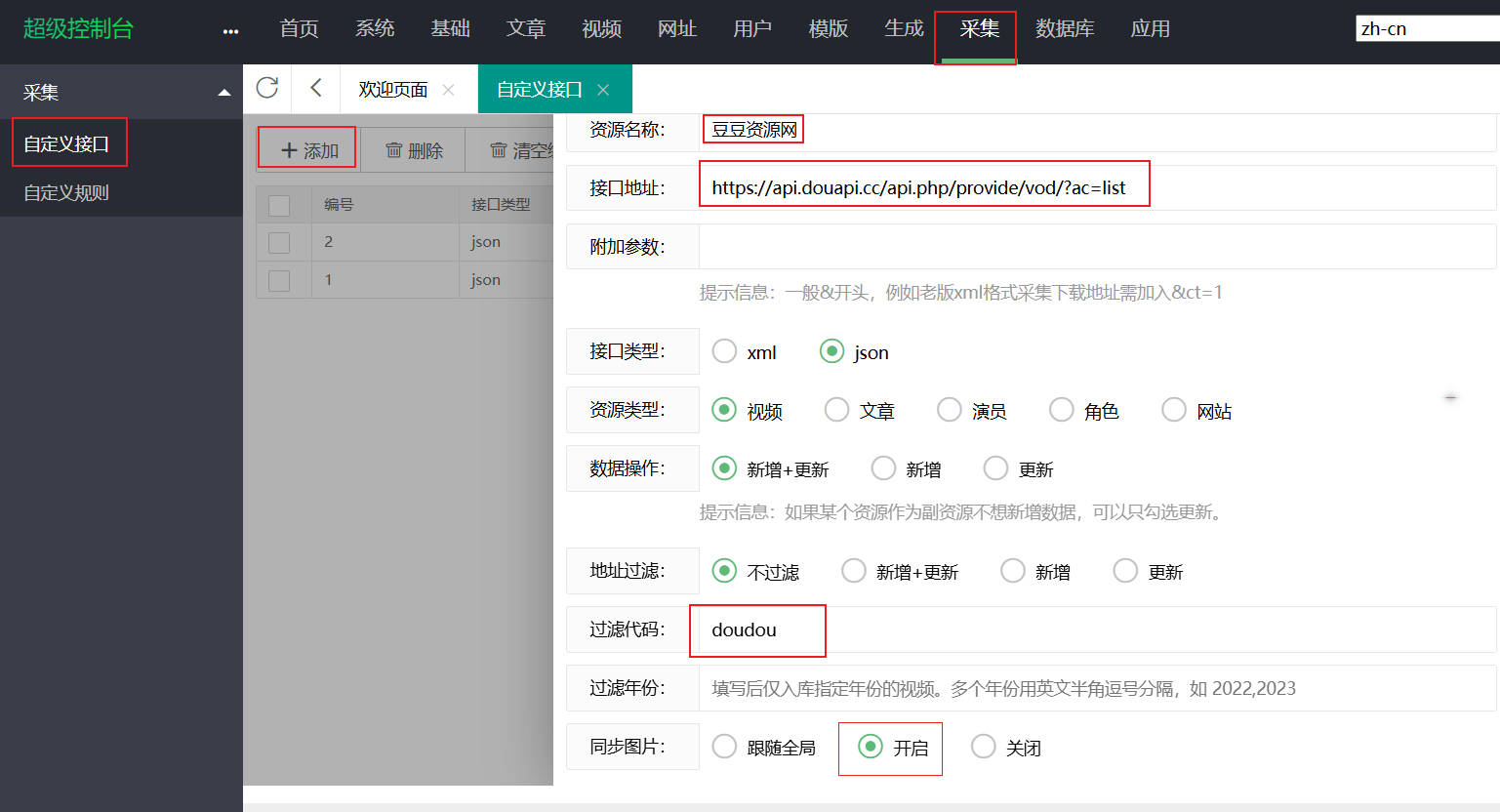 第二步:添加采集接口:https://api.douapi.cc/api.php/provide/vod/?ac=list